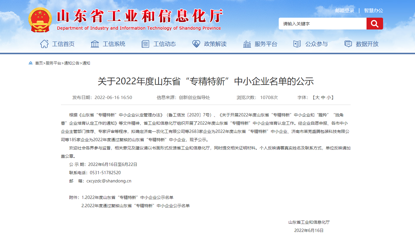 喜訊,沃華科技又一省級榮譽獲批!在山東省工業(yè)和信息化廳網(wǎng)站剛剛公布的,2022年度山東省“專精特新”中小企業(yè)公示名單中,山東沃華農(nóng)業(yè)科技股份有限公司榜上有名!