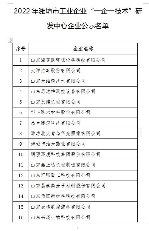 濰坊市工業(yè)和信息化局關(guān)于擬認(rèn)定2022年濰坊市工業(yè)企業(yè)“一企一技術(shù)”研發(fā)中心的公示于2022年9月27日正式確定,山東沃華科技成功入選。