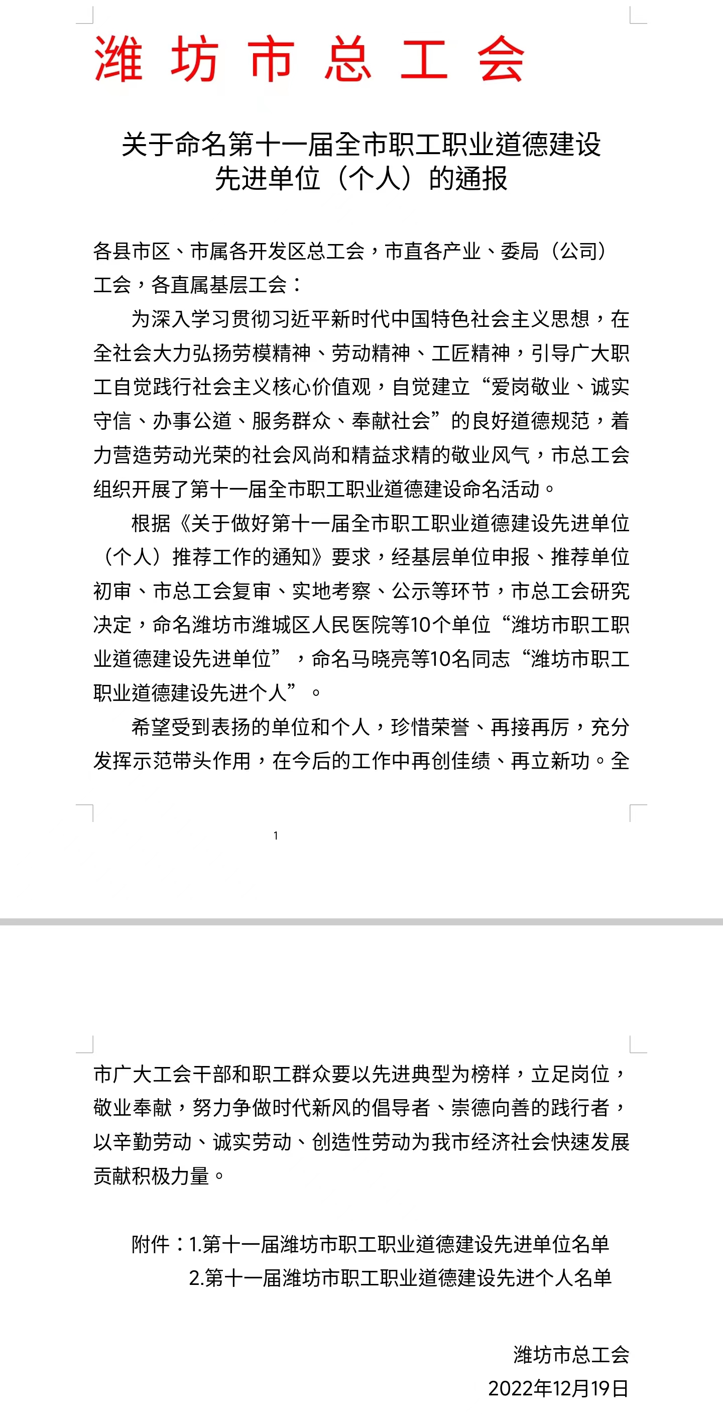 2022年12月19日,濰坊市總工會(huì)頒發(fā)了《關(guān)于命名第十一屆全市職工職業(yè)道德建設(shè)先進(jìn)單位(個(gè)人)的通報(bào)》,山東沃華榮獲濰坊市職工職業(yè)道德建設(shè)先進(jìn)單位榮譽(yù)稱號(hào)。