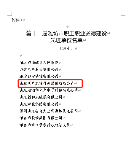2022年12月19日,濰坊市總工會(huì)頒發(fā)了《關(guān)于命名第十一屆全市職工職業(yè)道德建設(shè)先進(jìn)單位(個(gè)人)的通報(bào)》,山東沃華榮獲濰坊市職工職業(yè)道德建設(shè)先進(jìn)單位榮譽(yù)稱號(hào)。